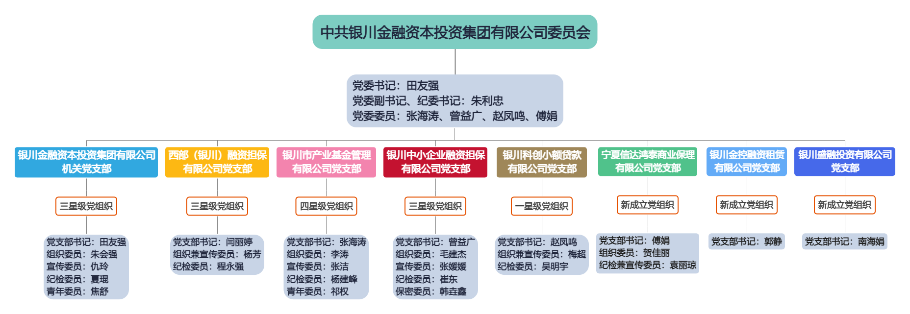 銀川金融資本投資集團(tuán)有限公司黨委于2019年12月6日成立,在銀川市委、市政府及市國資金融黨工委的領(lǐng)導(dǎo)下,堅(jiān)持以習(xí)近平新時(shí)代中國特色社會(huì)主義思想為指導(dǎo),堅(jiān)持正確的政治方向,宣傳貫徹落實(shí)黨的路線方針政策,嚴(yán)格按照上級(jí)有關(guān)部署開展各項(xiàng)工作,有效發(fā)揮黨建在企業(yè)經(jīng)營管理中管大局、把方向的政治引領(lǐng)作用。集團(tuán)黨委目前設(shè)立7個(gè)黨支部:中共銀川金融資本投資集團(tuán)有限公司支部委員會(huì)、中共西部(銀川)融資擔(dān)保有限公司支部委員會(huì)、中共銀川市產(chǎn)業(yè)基金管理有限公司支部委員會(huì)、中共銀川中小微企業(yè)科技小額貸款有限公司支部委員會(huì)、中共銀川中小企業(yè)融資擔(dān)保有限公司黨支部,中共銀川金控融資租賃有限公司黨支部,中共寧夏信達(dá)鴻泰商業(yè)保理公司黨支部。現(xiàn)有黨員104人,其中正式黨員101人、預(yù)備黨員3人、發(fā)展對(duì)象8人、積極分子32人。